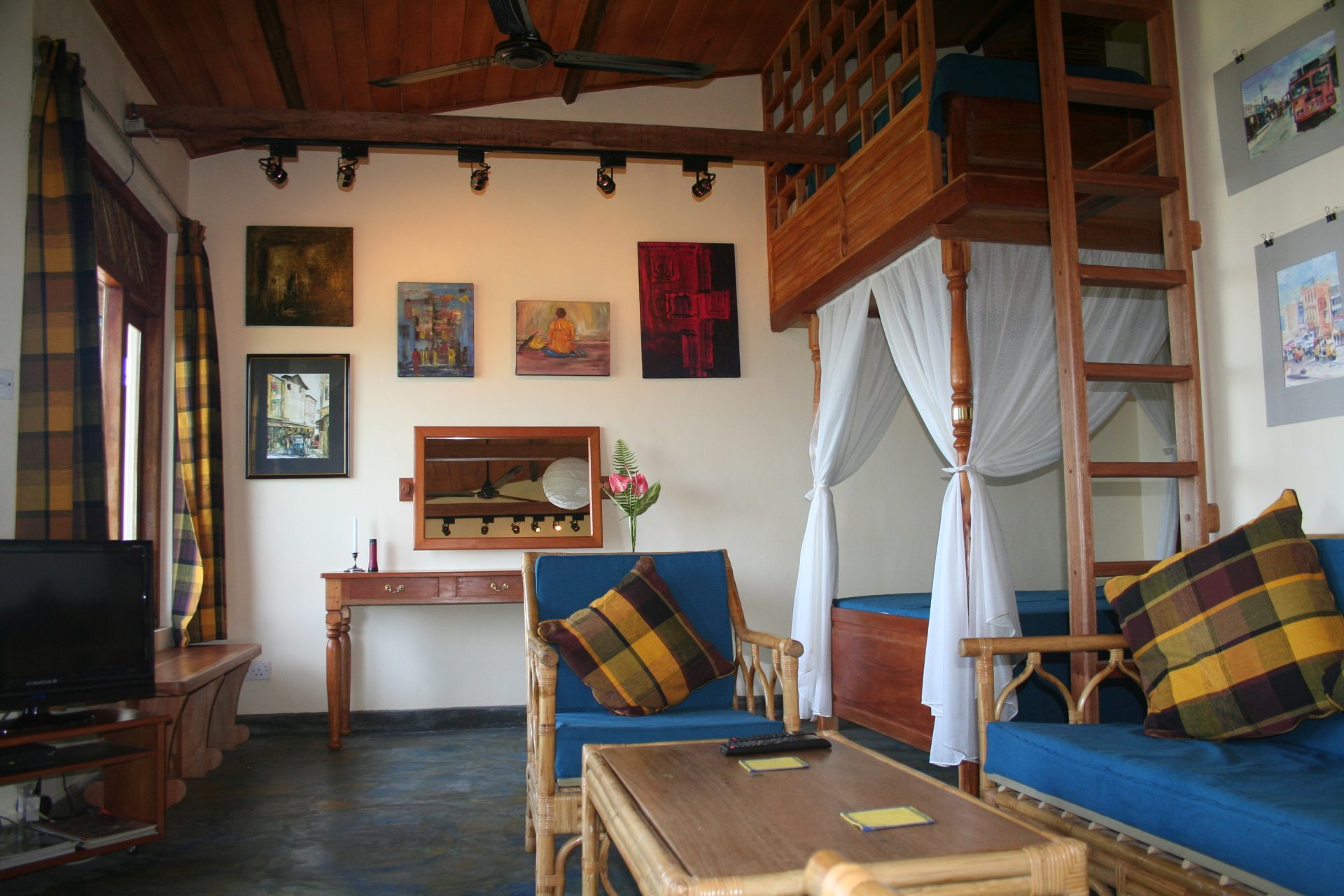 The Studio is a deluxe family room, slightly separate from the main villa, at the top of the South wing. It has its own private balcony and the all-round mountain views are breathtaking. There is sleeping accommodation for a maximum of 4, comprising a four-poster double bed plus a further double bed (or two singles) on a raised deck, accessible via a loft ladder. (Not suitable for the elderly or infirm.) There is a lounge area with TV as well as many contemporary paintings in a studio setting. This room is very popular with honeymooners or couples who favour its high elevation and seclusion.